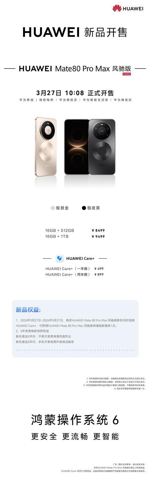 Mate80 Pro Max 风驰版 3 月 27 日开售,搭载麒麟 9030 Pro 芯片,业界首创隐藏式无感出风设计,仿生羽翼涡扇和超导热弯流翅片技术大幅提升散热效率。新机还配备鸿蒙 HarmonyOS 6 超丝滑方舟引擎,16GB 内存体验堪比 20GB。